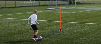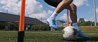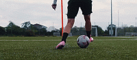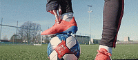 用我们的弱势脚越过球,然后做一个跺脚的动作,从球的边缘做出精准的切球动作。
