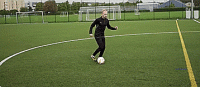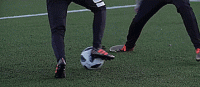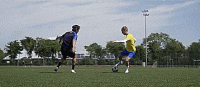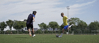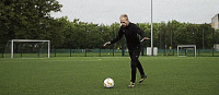 面对防守队员,我们要把身体摆成要传中或射门的样子,开始动作时,假装要射门,我们的腿摆动得很用力,但根本不会射门,只是在原地不动。