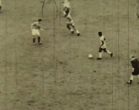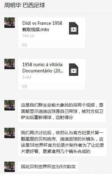 于是我询问了国内研究贝利多年的朋友周明华,之后贝利群群主史前大象为我找出了这个答案。原来,在1958年巴西对阵法国的官方集锦里,显示的是贝利助攻迪迪远射破门,但是史前大象通过这场比赛其他的视频资料发现,其实这个球的官方集锦为了视频流畅是有剪辑拼凑的。真实的情况是,迪迪自己带球被对方后卫铲球之后,又重回获得球权后远射破门,所以谜底解开了,下面我们来看一下两个画面有何不同。