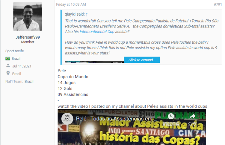 此前,我一直认为贝利在世界杯总共送出了10次助攻,但国外足球论坛bigsoccer上来自巴西的贝利助攻研究专家表示贝利的世界杯总助攻是9次,因为他通过历史报纸资料和视频资料统计了贝利职业生涯每一场正式比赛的助攻数据,是非常权威的一位大神。