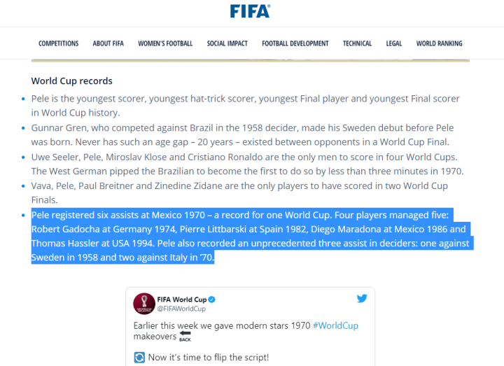 在这篇FIFA官方的文章里,说到贝利是唯一位在世界杯决赛历史送出过3次助攻的球员,在1958年世界杯决赛面对瑞典的比赛他送出过一次助攻(这次助攻从视频资料来看是颇具争议的,因为并不能确定贝利的脚是否触碰到了皮球,但FIFA官方给出的答案为助攻),此外贝利还在1970年对阵意大利的世界杯决赛上送出了2次助攻,而他在1970年世界杯总共送出6次助攻是世界杯历史单届的助攻王。所以贝利的这7次助攻(1958年决赛1次,1970年总共6次)有了FIFA官方的承认,而贝利其他几次助攻通过比赛录像也能轻易找到。所以贝利才是世界杯历史助攻王,他的世界杯助攻数是多于8次的马拉多纳和科帕(科帕的世界杯助攻M君有过详细的研究,并且每一次都有影像资料)的。