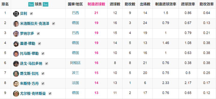 值得一提的是,贝利还是世界杯历史制造进球之王,他在世界杯的进球+助攻次数是历史上最多的,让我们来看一下我研究统计的世界杯历史制造进球数最多的9位球员: