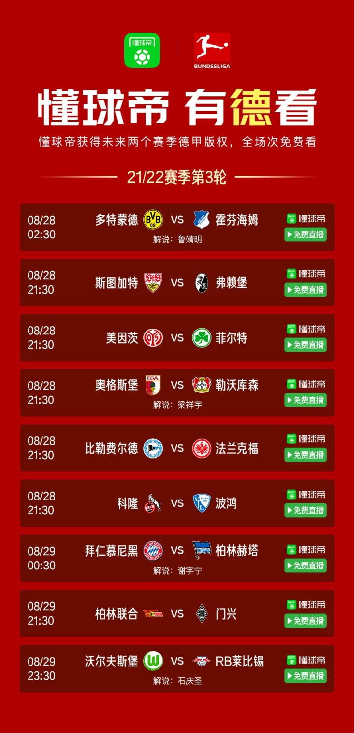 新赛季德甲第3轮比赛即将打响,球迷朋友们可以通过懂球帝App客户端、PC网页端以及其他懂球帝旗下国内产品免费收看德甲全场次比赛直播。本轮比赛,@鲁靖明 、@梁祥宇 、@足球解说-石庆圣 三位老师,以及D站解说@谢宇宁 将在懂球帝为大家带来精彩的解说评述~