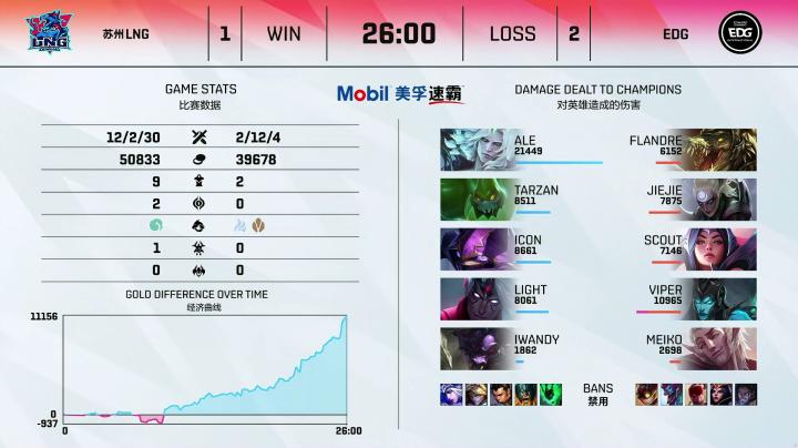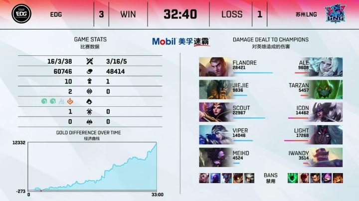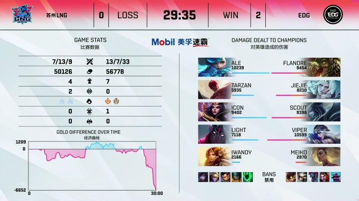 第32分钟,EDG抱团推上高地,妖姬爆炸伤害逼出韦鲁斯闪现,LNG无法阻止EDG的推进节奏,最终被一波结束比赛,恭喜EDG!