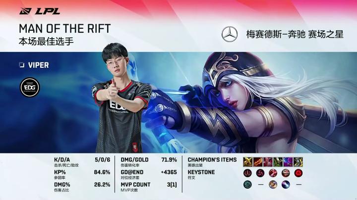 第3分钟,LNG打野盲僧强追佛耶戈未能击杀,EDG支援赶到反杀LNG打野盲僧,Viper拿到一血,随后的河蟹团EDG再次击杀LNG两人,EDG最终完成一波1换3。
