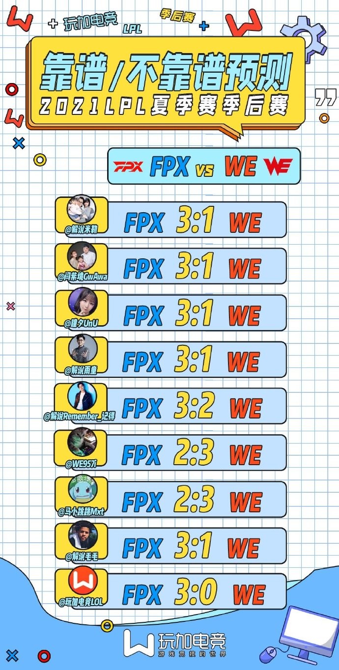 LPL解说预测季后赛:六人看好FPX,957、马老师预测WE获胜 峡谷全视野 峡谷全视野2021-08-27 15:58今天英雄联盟2021LPL季后赛将迎来WE vs FPX的比赛,赛前解说对赛果进行了预测:六人看好FPX战胜WE,WE957、WE马老师预测WE会以3-2战胜FPX。(来源:玩加电竞)展开更多