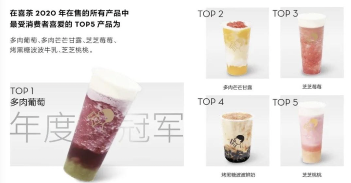 这话不是我们胡乱说的,而是消费者们的选择。据喜茶自己公布的数据,2020年,喜茶最受消费者喜爱的TOP 5 产品中,有4款都是水果为主的茶饮。
