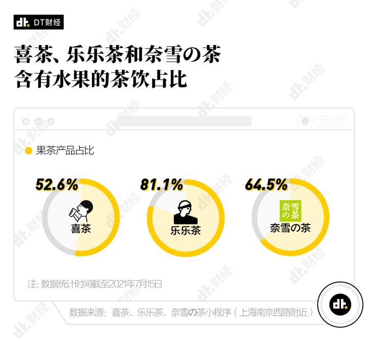 结果发现,各家茶饮店产品中,果茶的占比都超过一半,而乐乐茶已经将自己果茶的比例扩大到了8成以上,比起奶茶店,果茶店反而更符合乐乐茶现在的定位。