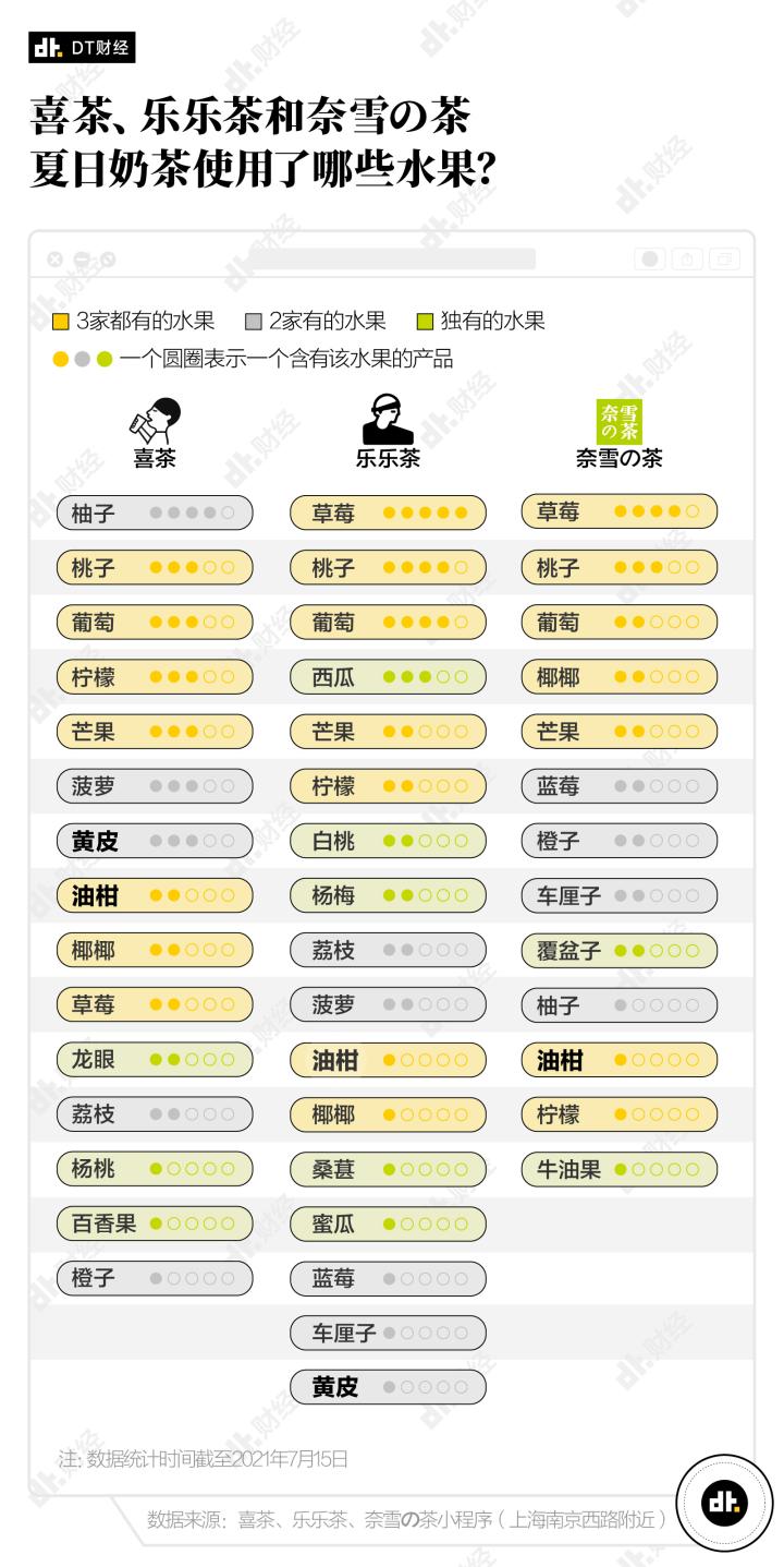有人的地方就有流量,有流量的地方就能选秀。为了去探讨果茶背后的财富秘密,我们统计了喜茶、乐乐茶和奈雪の茶的菜单,决定先来一次夏日奶茶杯水果101。