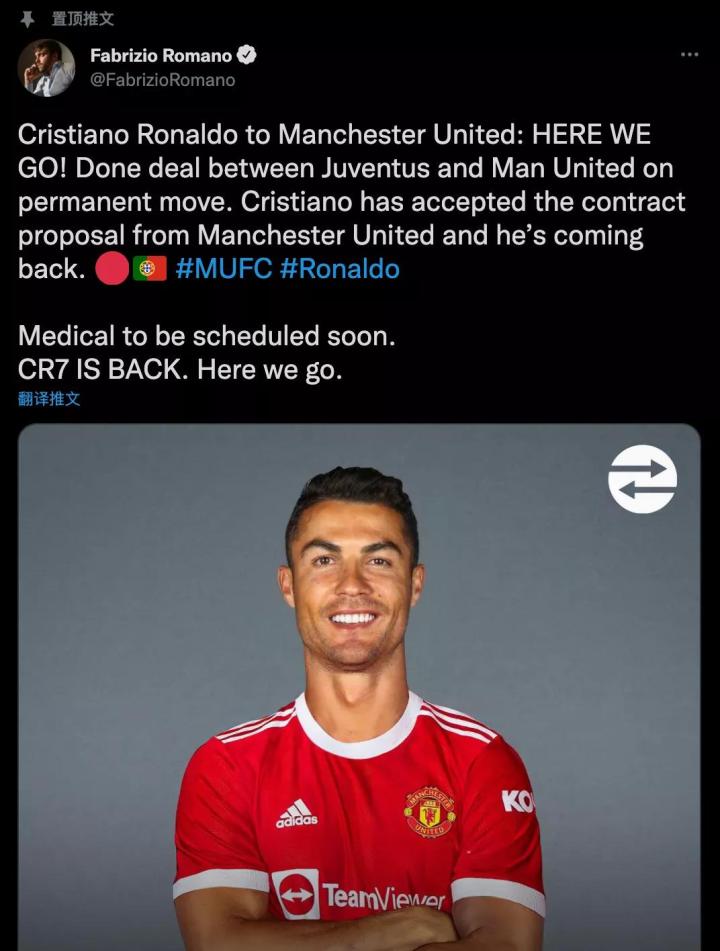 在C罗官宣之后,他在推特上发出了那句著名的「Here We Go」
