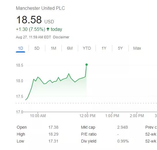 8月27日C罗加盟曼联消息传出到官宣期间,曼联的股价变动