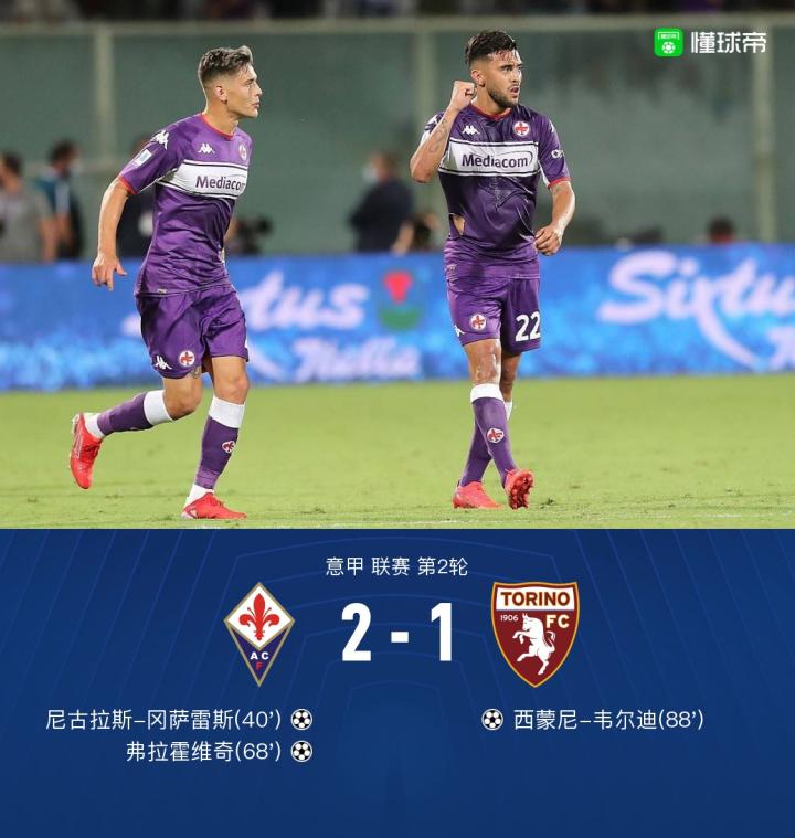 北京时间8月29日,意甲第2轮,佛罗伦萨主场对阵都灵。上半场,冈萨雷斯内切打门扑出,米伦科维奇头球被扑,尼古拉斯-冈萨雷斯打破僵局。下半场,萨纳夫里亚抽射打高,弗拉霍维奇头球建功,西蒙尼-韦尔迪扳回一分,最终,佛罗伦萨2-1都灵。