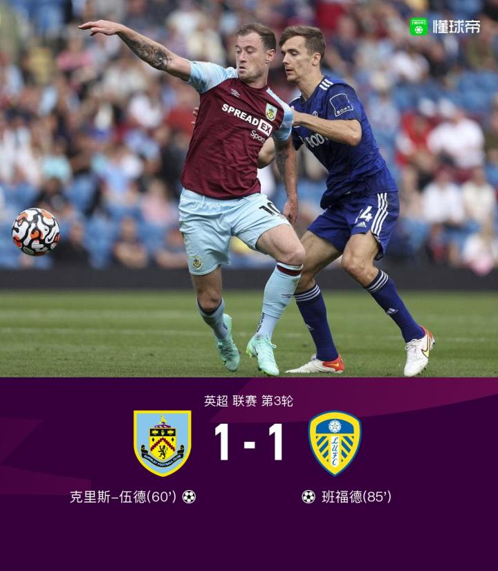 北京时间8月29日晚间21:00,英超联赛第3轮,伯恩利对阵利兹联。上半场,双方身体对抗非常强硬,菲利普斯的射门造成威胁。下半场,克里斯-伍德破门,班福德终场前追平比分。最终,伯恩利1-1利兹联。