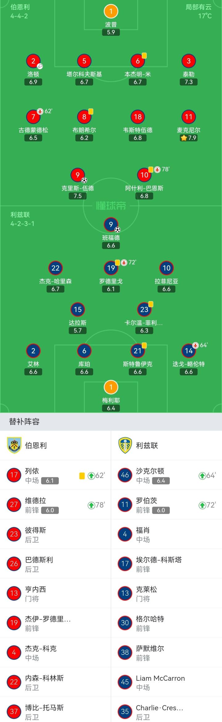 伯恩利首发:1-波普、2-洛顿、5-塔尔科夫斯基、6-本杰明-米、3-泰勒、7-古德蒙德松(62'17-列侬)、18-韦斯特伍德、8-布朗希尔、11-麦克尼尔、9-克里斯-伍德、10-阿什利-巴恩斯(78'27-维德拉)