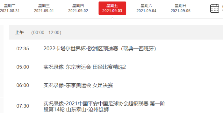 其中,CCTV5在9月3日凌晨2点时间段暂时安排的节目是“实况录像-2020/2021赛季中国男子篮球职业联赛 半决赛2”;CCTV5+在同一时段安排的节目则是“2022卡塔尔世界杯-欧洲区预选赛(瑞典—西班牙)”。
