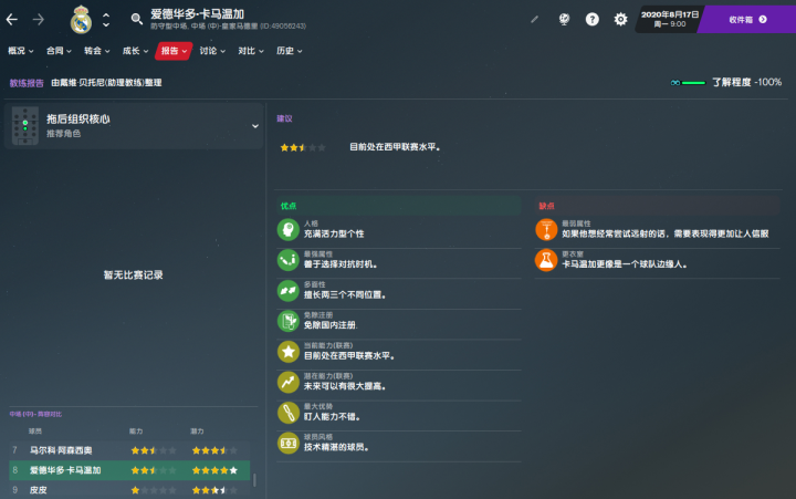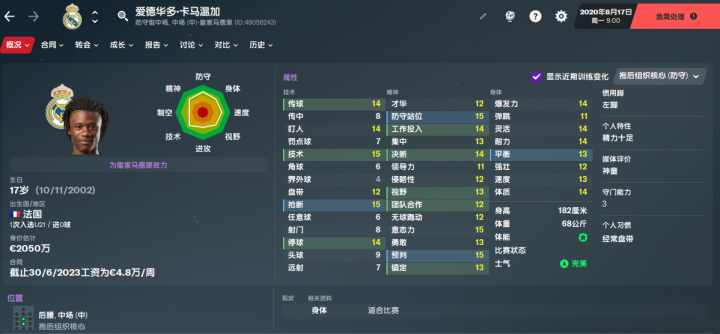 从FM的技术属性图来看,卡马文加属于攻守兼备的类型,技术(15)、传球(14)与停球(14)不错,同时拥有一定的抢断(15)、盯人(14)能力,在这样的年纪能够拥有如此属性,显然是一名顶级中场的好苗子。