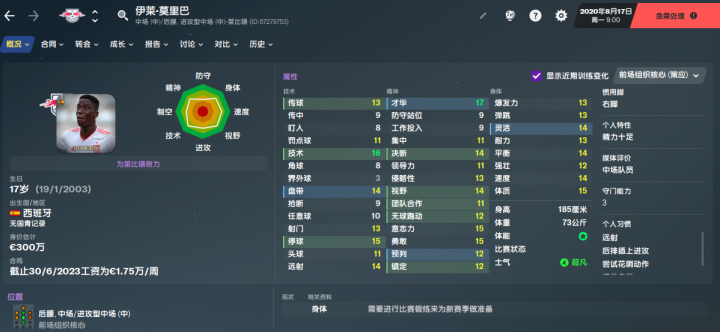 莫里巴的精神属性中,可以更加确信他拥有极高的进攻才华(17)、视野(14)、团队合作(112)、无球跑动(12)。