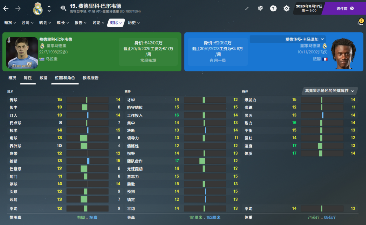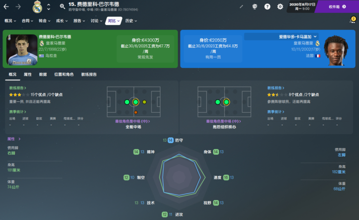 为了更形象的了解卡马文加,我选择了稍微年长的巴尔韦德与其进行数据对比。通过对比可见,技术层面巴尔韦德要比卡马文加偏向进攻,传球、射门、传中、任意球等脚法属性更优秀,而卡马文加的优势项在于防守。