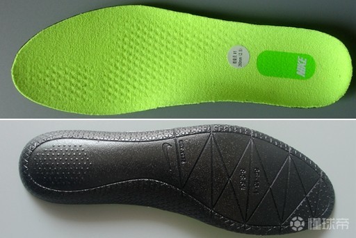 鞋垫做得比较用心,相对于顶级球鞋来说的话用料上差一点,但细节比较丰富,这点不输甚至强过很多顶级。前掌正面部分区域有凹凸的摩擦颗粒,凹凸设置在发泡鞋垫上,上面覆盖较细致的布面,后掌Nike标志下还有一层深绿色的膜,而不是直接印在布面上。鞋垫反面周边是三角形花纹,前掌最前端和后掌带有细小的突出颗粒,这两处可以起到一定的防滑效果,前掌带有很多横向和斜向的条纹,更有利于跑动中弯。总之从这双鞋垫上我们仿佛听到设计师在说:“上面不让堆用料,那我给你们加点设计吧。”鞋垫厚度,后掌5mm,前掌4.5mm。