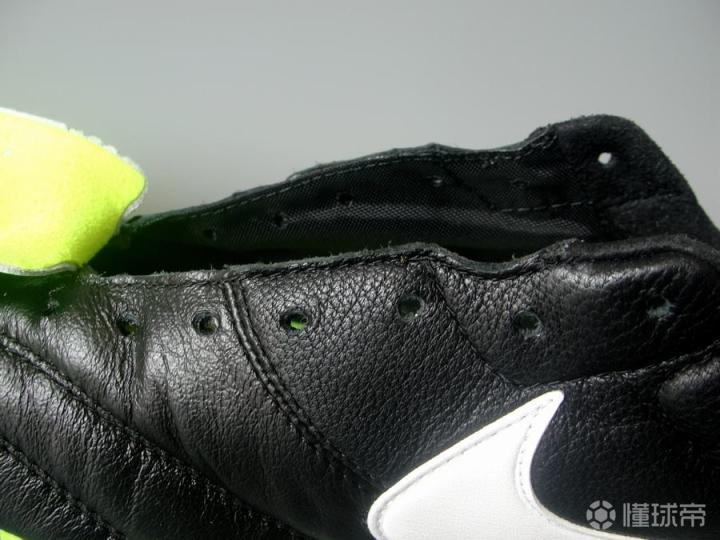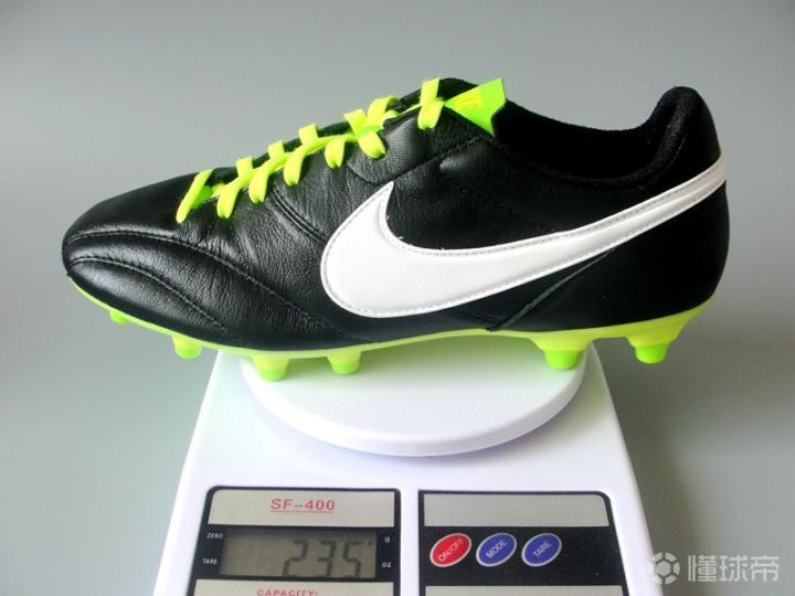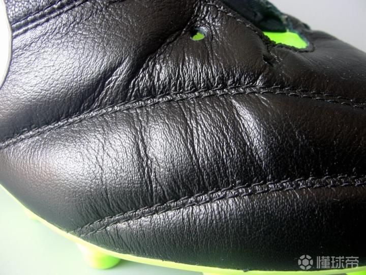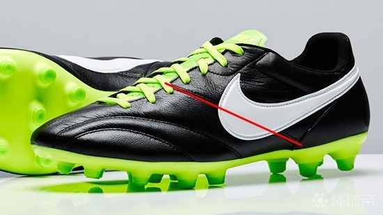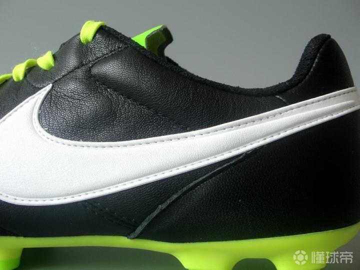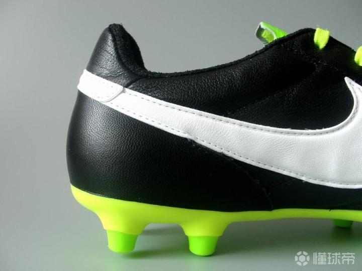Nike Premier配置了全真皮的鞋面,前1/3为袋鼠皮。(黑绿色Premier与其他几种配色的配置都是完全相同的。)全皮鞋面近年来很少见,一是因为成本太高,二是因为做好支撑性比较难,所以即使顶级球鞋全皮也很少见,何况Premier官方定价110美元/110欧元/899人民币,也就是一般球鞋次顶级的价格,单看这点就足以说它的配置非常厚道了。鞋身两侧的Nike Swoosh一直延伸到后跟并且连通在一起,非常地写意。虽让宽脚穿它毫无不适感,但鞋型实际上偏瘦,而且长度上偏短,正常脚型都需要买大半码,屠龙脚建议买大1码。