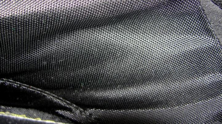 内衬是网布材料,真皮球鞋的典型设计,主要保证舒适但质感、摩擦力都一般般,可以看出此处和球鞋的设计思路也是一致的。内衬与袋鼠皮之间填充有缓冲海绵,可以更好地发挥袋鼠皮的特性,提高触球效果。山羊皮与内衬之间没有填充物,但也不显生硬,因为山羊皮本身就很软。