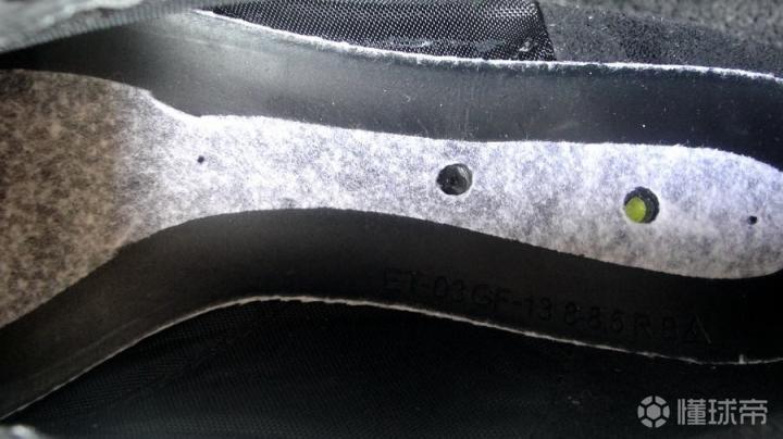 鞋舌材质为人造PU,厚度约1.5mm,防跑偏开孔周围有填充海绵,接球时可以起到缓冲作用,缓冲区域厚度实测约4mm。