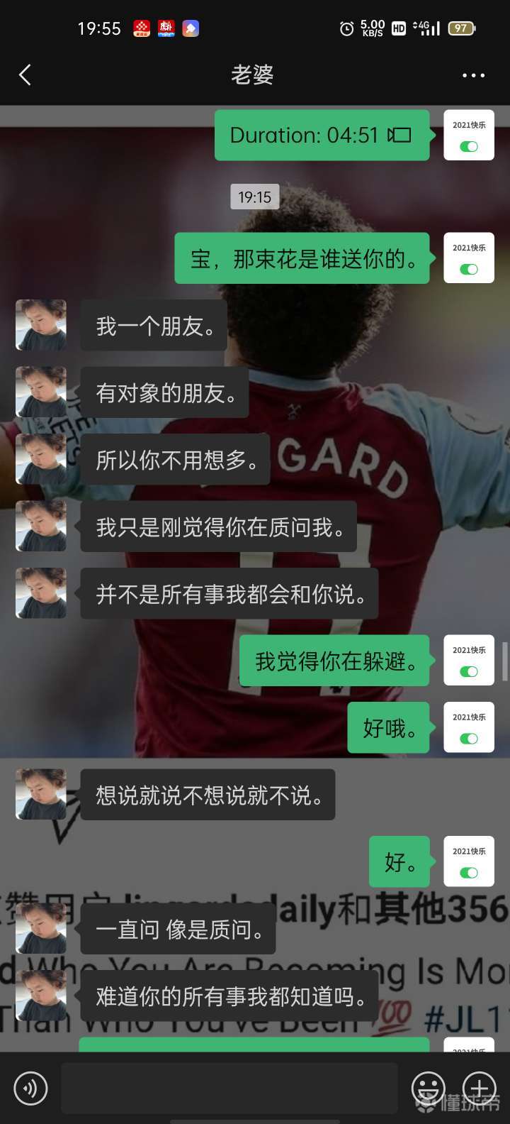 背景:女朋友emo的时候,经常换头像,改签名,发丧文字。 经过:昨天她朋友圈发了生日的那天很多男同事给她发红包,送果篮的截图,文案是美好在身边,但个签却悄悄改成了什么都差点意思。 今天下午,她莫名忽然心情不好,我给她打电话想了解原因,却发现她身后多了一束刚买的鲜花。我先是问她:咦,想不到你还买了花?但她避而不谈。聊了几句,我又问:是不是姐姐给你买的?她又换了个话题跟我聊。我第三次直接问她,是什么时候买的花,她说心情不好,不想说话,然后视频里也看不到她了。 之后我跟她这样聊啦,她说她心情之前就不好,不想说话,觉得我是在质问她。她说,花只是一个朋友送的,有对象的朋友,叫我不要多想,不要患得患失。 是我多想了么?我觉得我好像更加患失了。