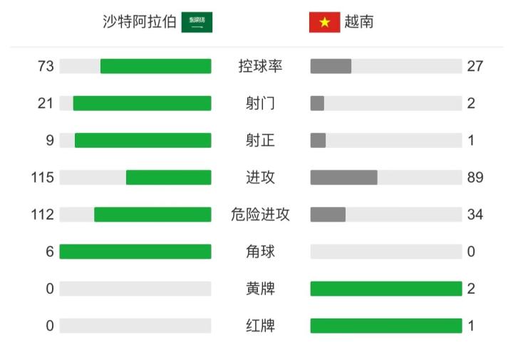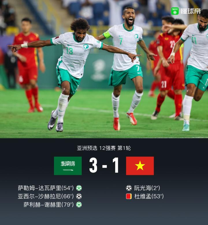 北京时间9月3日2:00,世预赛亚洲区12强赛B组第1轮,沙特阿拉伯对阵越南。上半场,阮光海远射破门,萨勒姆-达瓦萨里抽射被门将没收,奥泰夫伤退。下半场,杜维孟送点后累计两黄被罚下,达瓦萨里点射破门,沙赫拉尼头球反超,谢赫里勺子点球锁定胜局,最终,沙特3-1逆转越南
