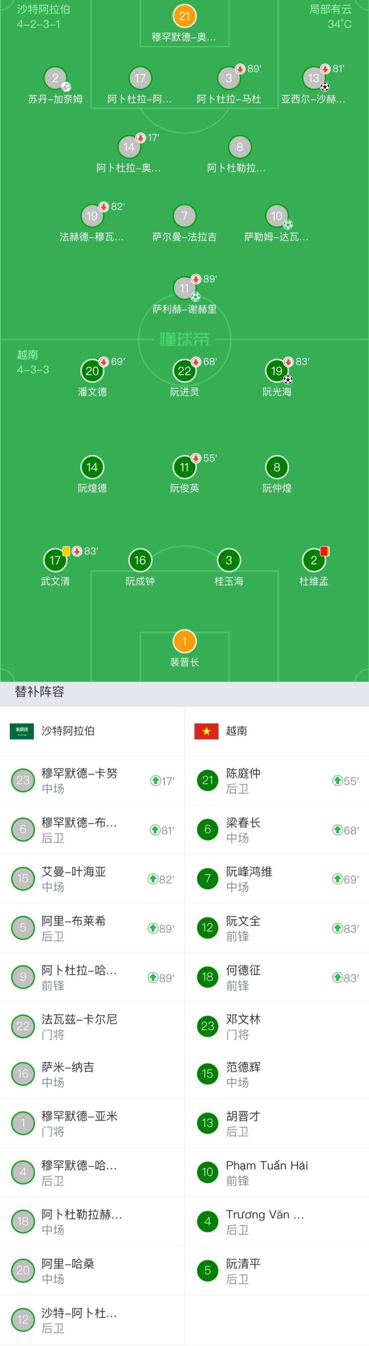 沙特首发:21-穆罕默德-奥韦斯、2-苏丹-加奈姆、3-阿卜杜拉-马杜(89'5-阿里-布莱希)、7-萨尔曼-法拉吉、8-阿卜杜勒拉赫-马尔基、10-萨勒姆-达瓦萨里、11-萨利赫-谢赫里(89'9-阿卜杜拉-哈姆丹)、13-亚西尔-沙赫拉尼(81'6-穆罕默德-布莱克)、14-阿卜杜拉-奥泰夫(17'23-穆罕默德-卡努)、17-阿卜杜拉-阿姆里、19-法赫德-穆瓦拉德(82'15-艾曼-叶海亚)