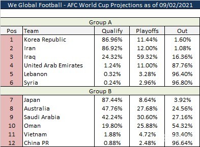 数据网站预测国足晋级世界杯概率:跌至0.88%ETChalmers @懂球帝2021-09-03 06:11在国足12强赛首战0-3不敌澳大利亚后,数据网站We Global Football更新了国足晋级世界杯的概率,降至0.88%。今年6月,国足闯进12强赛时,数据网站预测国足晋级世界杯的概率为3.68%,在12支球队中位列倒数第二,只比黎巴嫩高。而在国足12强赛首战输给澳大利亚后,国足晋级世界杯的概率跌至0.88%,晋级附加赛的概率为2.48%,被淘汰的概率为96.64%。展开更多