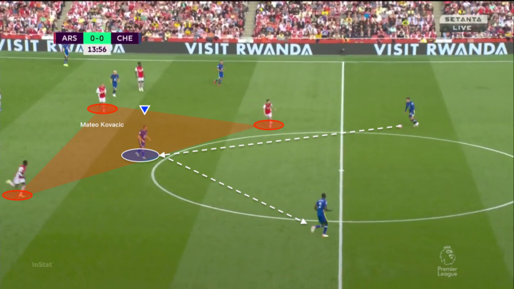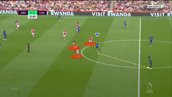克里斯滕森传球给到切尔西组织核心科瓦契奇后阿森纳前场三人才向前封堵他传球路线,但球员依然可以选择回传等待下一个时机,因此后者选择直接向后回传