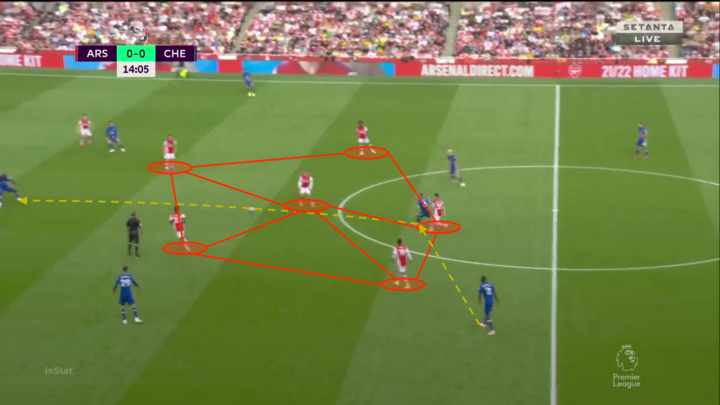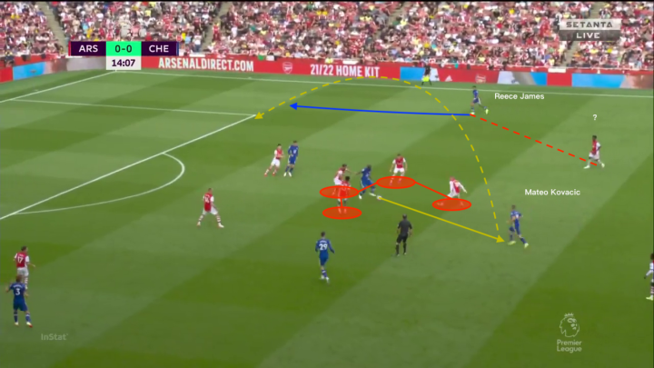 科瓦契奇过渡到前场后,在观察到从右翼位置插上里斯·詹姆斯后,由于没有受到任何阿森纳球员的压迫,科瓦契奇很轻松的就接到了来自卢卡库的回传球,一记漂亮的挑传打向右路位置插上的小将里斯·詹姆斯。