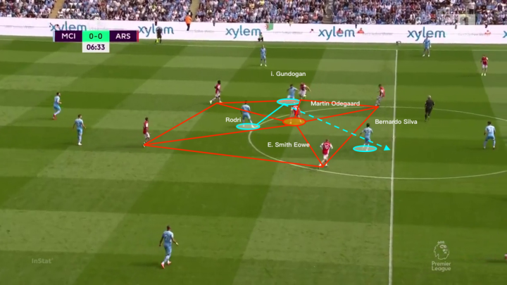 曼城可以很容易地利用他们的短传渗透和两个侧翼来利用阿森纳的半场空间,因为阿森纳的防守策略通常是混乱和无效的,这让阿森纳的防线愈拖愈后。随着曼城在边路传中次数的不断增加和两个侧翼边后卫的前压,为边锋提供支援,让枪手很难阻止曼城进入进攻三区当中。于是: