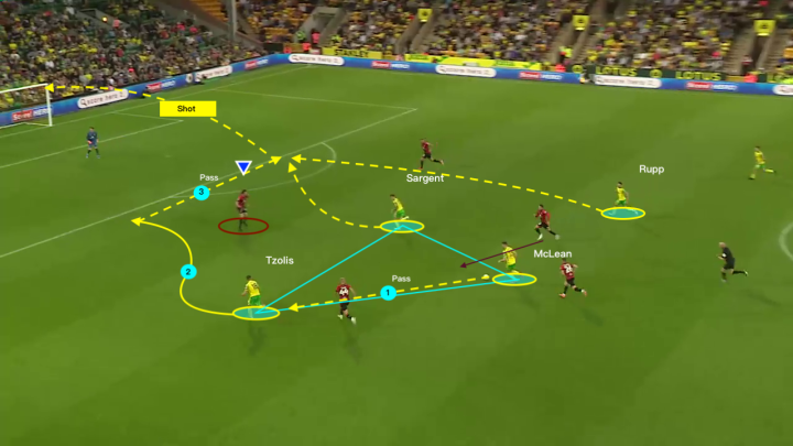 又是一次三人进攻体系的配合,道尔在进入进攻三区后就拿球内切,传球给到麦克莱恩手中最后横传由拖后插上的萨金特完成最后一击