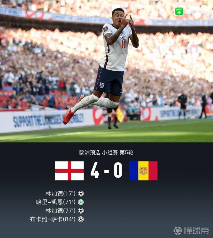 英格兰4-0安道尔,林加德双响+助攻,凯恩、萨卡破门