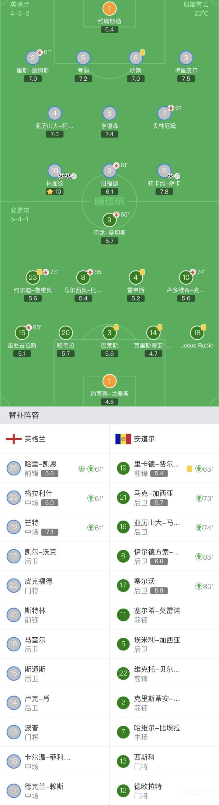 比赛第18分钟,林加德大禁区内接球横抽破门。英格兰1-0安道尔。