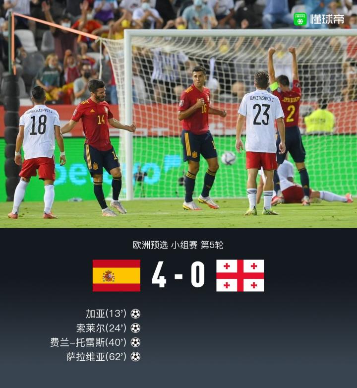 西班牙4-0格鲁吉亚,萨拉维亚、索莱尔破门,略伦特助攻双响