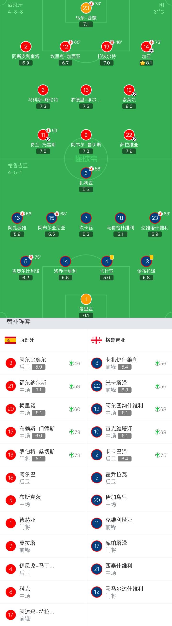 西班牙首发:23-乌奈-西蒙(73'13-罗伯特-桑切斯)、2-阿斯皮利奎塔、12-埃里克-加西亚(60'20-梅里诺)、19-拉波尔特(46'3-阿尔比奥尔)、14-加亚(73'15-门德斯)、6-马科斯-略伦特、16-罗德里、10-索莱尔、22-萨拉维亚、9-鲁伊斯、11-费兰-托雷斯(59'21-福尔纳尔斯)