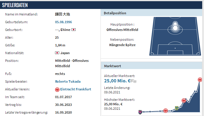 法兰克福,这支历史上和亚洲足球有着深厚感情的德甲俱乐部,在2017年夏天以160万欧元签下了刚刚“早婚”的镰田大地。时任法兰克福体育主管博比奇表示:“我们在诸多比赛中看到了镰田大地的无限潜力,他会为球队的前场进攻带来更多变化。”来到法兰克福的镰田大地并未感到孤独,因为老大哥长谷部诚已在此等候,“我很期待认识新队友,并会把握住这个令人激动的机会。”