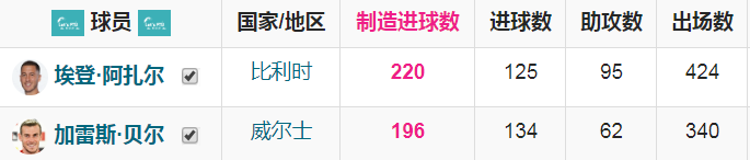 五大联赛:贝尔340场134球62助攻制造196球,阿扎尔424场125球95助攻制造220球。(仰卧撑/邱翼曦)