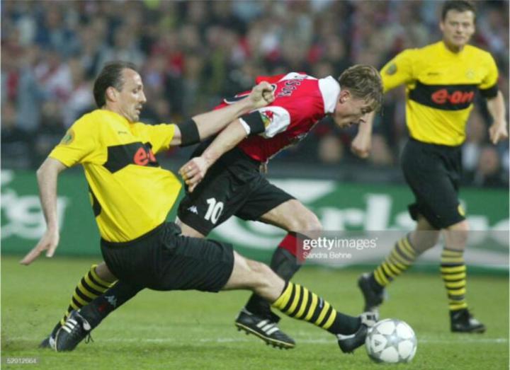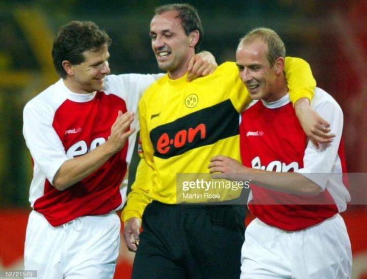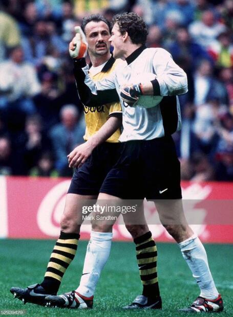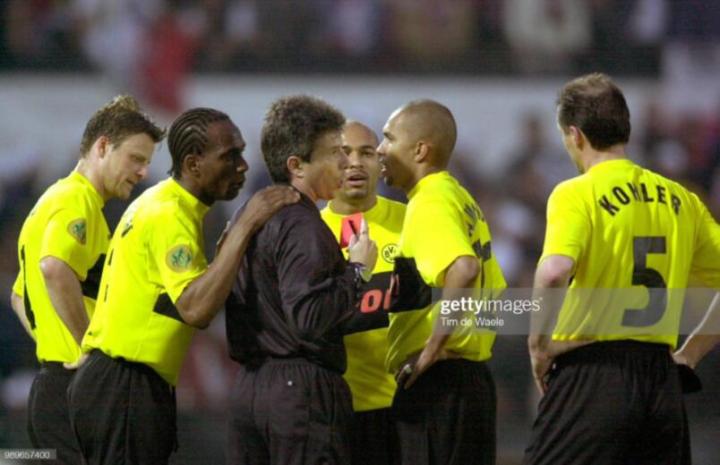 据说在欧冠决赛前的采访中,多特蒙德前锋里德尔在说自己做梦梦见将在决赛中梅开二度,其中一个还是头球,可能很多尤文图斯球迷都觉得这是在白日做梦,因为当时的斑马军团实力强出多特蒙德不少。可没想到这个梦居然成真, 里德尔真的在上半场比赛中头顶脚踢梅开二度。而科勒尔领衔的后防线更是让尤文图斯的锋线举步维艰,就算是博克西奇这样的壮汉,也无法摆脱老辣的科勒尔。虽然皮耶罗为尤文图斯扳回一城,但替补出场的里肯用一脚吊射彻底熄灭了尤文图斯的希望。最终多特蒙德爆冷夺冠,科勒尔也完成了职业生涯荣誉大满贯的里程碑。当时多特蒙德队全队都必须使用nike球鞋,只有队长萨默尔例外,他缴纳了罚款和违约金穿的adidas球鞋。