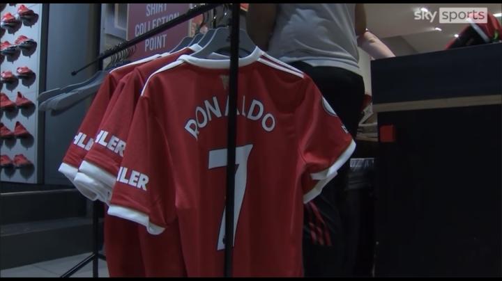 C罗的新球衣不仅在网上很抢手,老特拉福德的俱乐部商店也是一个受欢迎的目的地。周五早上,球迷们排着长队想要拿到球衣。
