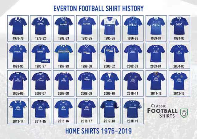 当俱乐部迁至古迪逊时,他们穿着三文鱼条纹的蓝色短裤(这是百年庆典套装的起源,你顿上赛季2客不就是模仿这个麽),后来还穿着红宝石色的衬衫,以及蓝色镶边的深蓝色短裤。最著名的皇家蓝球衣和白色短裤最早使用于1901-1902年,这毫无疑问是“蓝军”绰号的起源。
