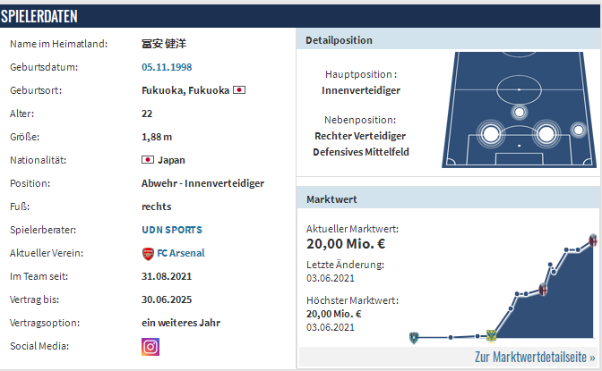 进入2020-21赛季,伤愈复出的富安健洋不仅重返主力阵容,并根据战术而改踢右后卫(偶尔客串中卫和左后卫),这让他的赛场表现继续提升,并在整个赛季贡献了2粒联赛进球。自此,富安健洋开始和AC米兰等诸多豪门球队传出绯闻,德转市场的身价则渐渐升至2000万欧元。直至今夏转会窗口关闭前,英超豪门阿森纳把这位日本国脚带到了酋长球场。