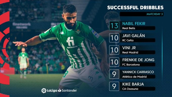西甲最新成功过人榜:费基尔领跑,维尼修斯、德容上榜LaPulga @懂球帝2021-09-08 23:21西甲官方晒出了联赛目前为止的最新成功过人榜,皇家贝蒂斯攻击手费基尔以13次成功过人排名榜首。西甲最新成功过人榜(截至第三轮)13次 费基尔 皇家贝蒂斯10次 哈维尔-加兰 塞尔塔10次 维尼修斯 皇家马德里10次 弗朗基-德容 巴塞罗那9次 卡拉斯科 马德里竞技9次 巴尔哈 奥萨苏纳展开更多