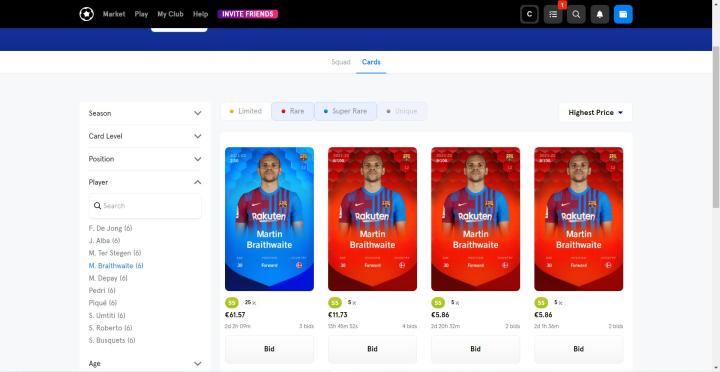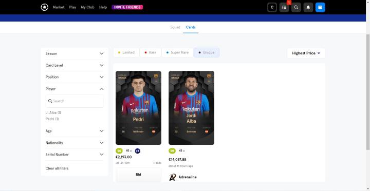 以皮克所效力的巴塞罗那俱乐部球员为例,德佩近期的表现非常出色,有望在接下来的比赛中代表巴萨连场破门,如果玩家现在想购买一张他的蓝色卡牌(每名球员的蓝色卡牌在游戏中仅存在10张),最高价格可能会达到6450欧元;而德佩的红色卡牌(每名球员的红色卡牌在游戏中仅存在100张)最高价格约为96.75欧元。