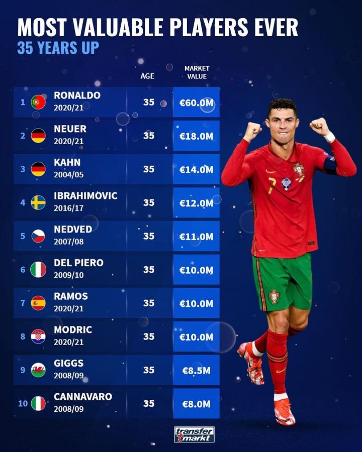 足坛史上35岁球员身价排行:C罗高居榜首,诺伊尔列次席