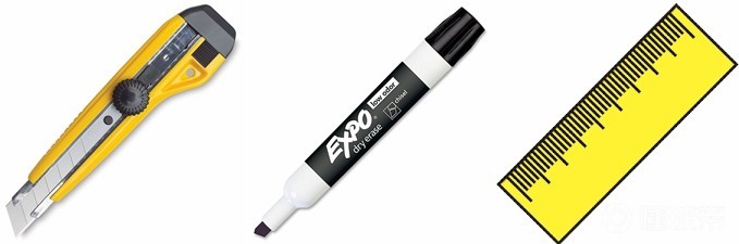 第二是准备好需要的工具,可以不用买高级工具,但基本的一定要齐全,美工刀、记号笔(也可以用其他笔代替)、尺子是最低要求。如果再准备一张砂纸用来打磨边缘,那么恭喜你,你的加工精细程度已经超越了很多磨钉人了。