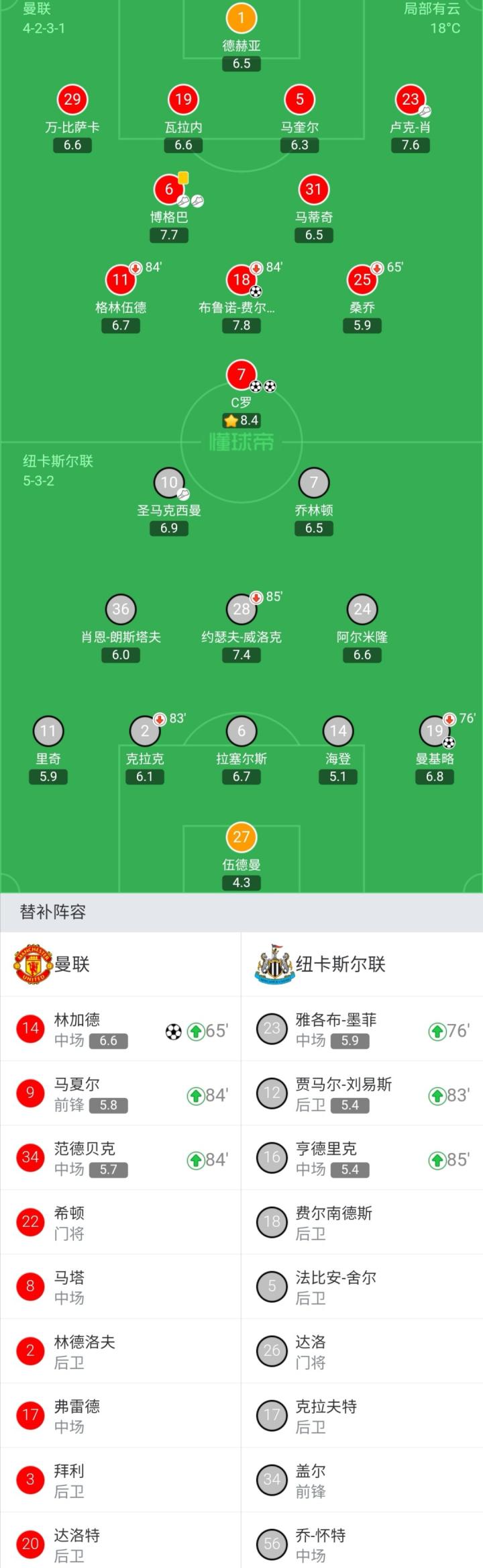 曼联首发:1-德赫亚、29-万-比萨卡、19-瓦拉内、5-马奎尔、23-卢克-肖、31-马蒂奇、6-博格巴、18-布鲁诺-费尔南德斯(84'9-马夏尔)、11-格林伍德(84'34-范德贝克)、25-桑乔(65'14-林加德)、7-C罗