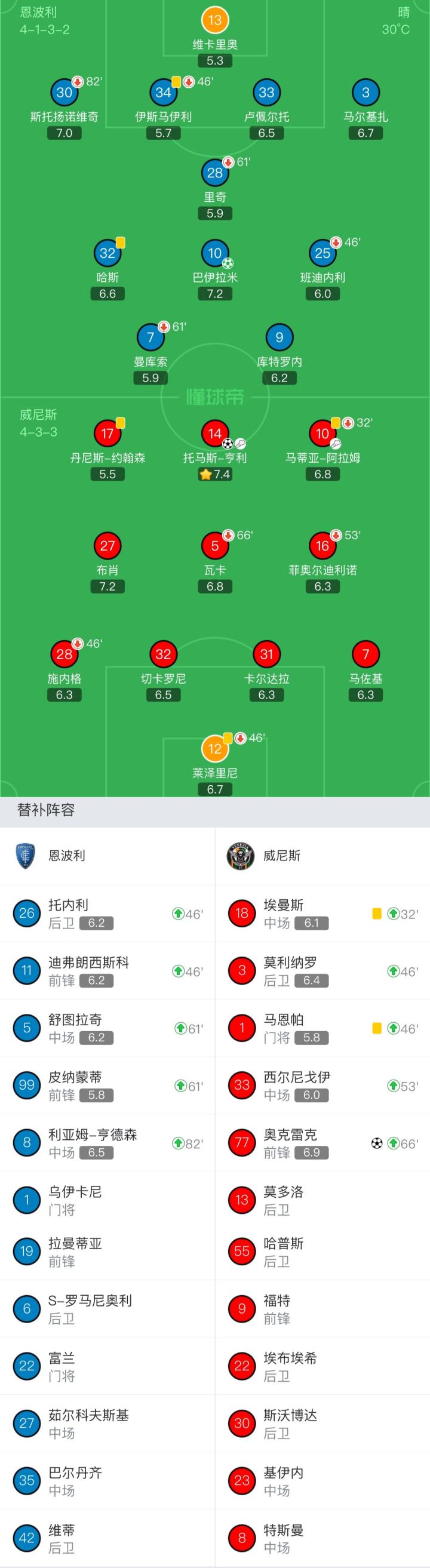 恩波利首发:13-维卡里奥、3-马尔基扎、33-卢佩尔托、34-伊斯马伊利(46'26-托内利)、30-斯托扬诺维奇(82'8-利亚姆-亨德森)、25-班迪内利(46'11-迪弗朗西斯科)、28-里奇(61'5-舒图拉齐)、32-哈斯、10-巴伊拉米、7-曼库索(61'99-皮纳蒙蒂)、9-库特罗内